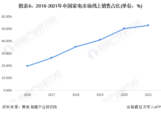 2016-2021年,我国家电市场线上销售份额占比逐年提升,2020年疫情推动加之消费者购物习惯的改变,线下销售份额占比首次低于线上销售额占比。2021年线上渠道占比达到52.9%,较2020年提升2.5%%。