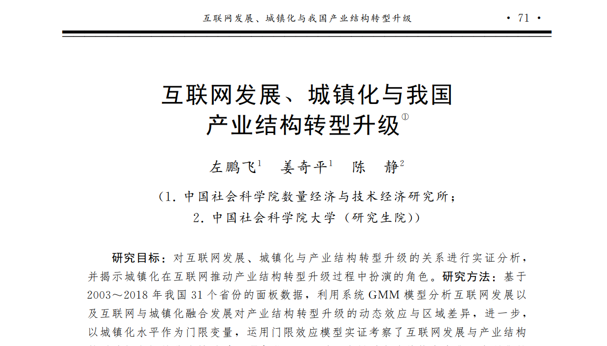 左鹏飞,姜奇平,陈静.互联网发展、城镇化与我国产业结构转型升级[J].数量经济技术经济研究,2020,37(07):71-91.
