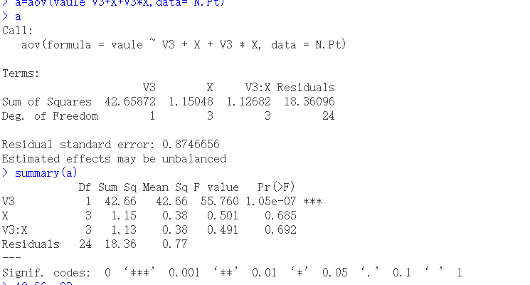 > a=aov(vaule~V3+X+V3*X,data= N.Pt)> aCall: aov(formula = vaule ~ V3 + X + V3 * X, data = N.Pt)Terms: V3 X V3:X ResidualsSum of Squares 42.65872 1.15048 1.12682 18.36096Deg. of Freedom 1 3 3 24Residual standard error: 0.8746656Estimated effects may be unbalanced> summary(a) Df Sum Sq Mean Sq F value Pr(>F) V3 1 42.66 42.66 55.760 1.05e-07 ***X 3 1.15 0.38 0.501 0.685 V3:X 3 1.13 0.38 0.491 0.692 Residuals 24 18.36 0.77 ---Signif. codes: 0 ‘***’ 0.001 ‘**’ 0.01 ‘*’ 0.05 ‘.’ 0.1 ‘ ’ 1