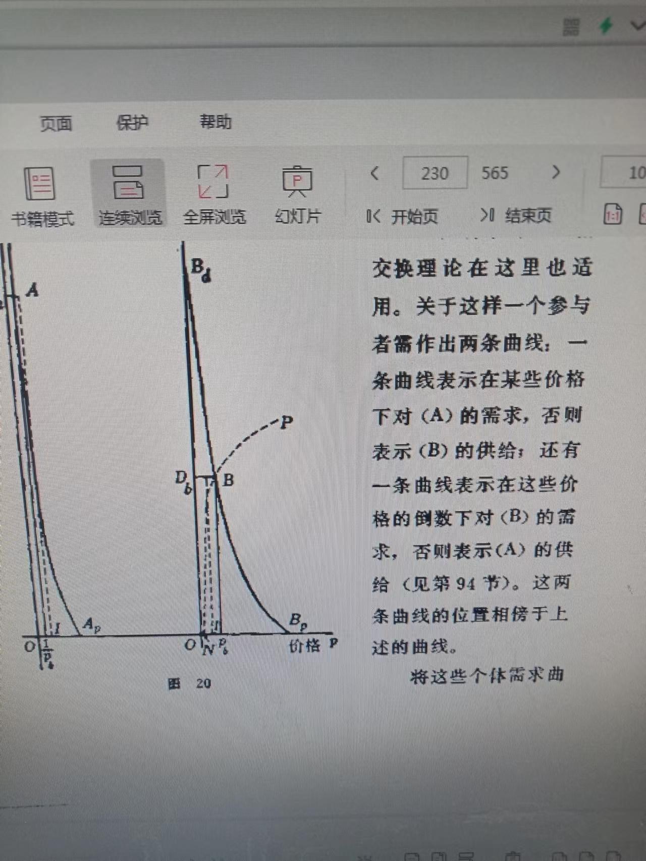 我已经告诉你了,在第十五章,指定一种商品(A)为通货时,其他所有商品的价格都是以通货计的价格,即货币价格。此时,“两种商品互相交换理论在这里也适用”,例如,通货(A)与商品(B)的交换,可以分别作出对(A)和对(B)两条需求曲线,对应的是(B)和(A)的供给曲线。(图20)