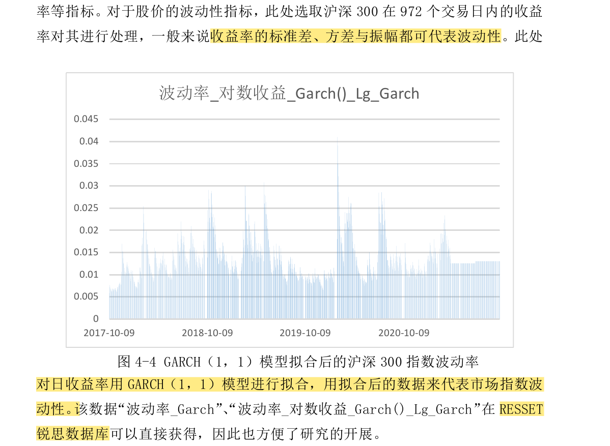 因为我们学校没有买resset数据库,我手头上只能获得沪深300的日收益率,只能自己进行模型操作。所以我想问下,这个图上的garch是怎么来的?是对沪深300的日收益率进行对数处理后,再用软件进行garch(1,1)吗?还是由其他步骤产生的?