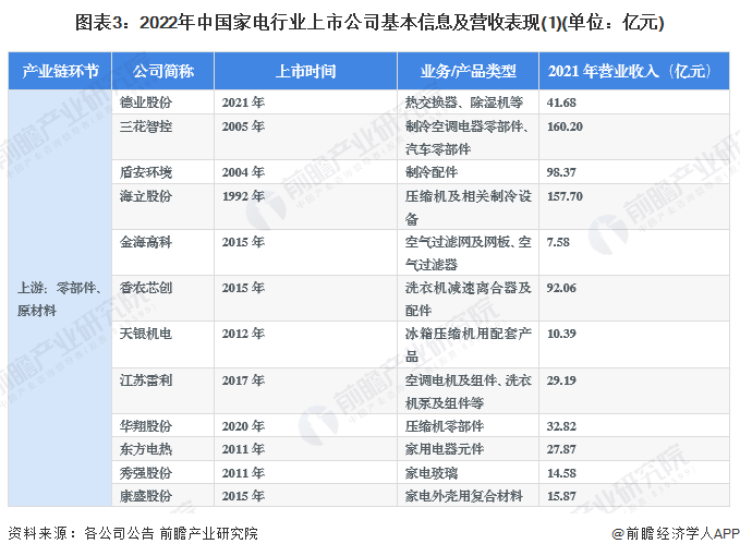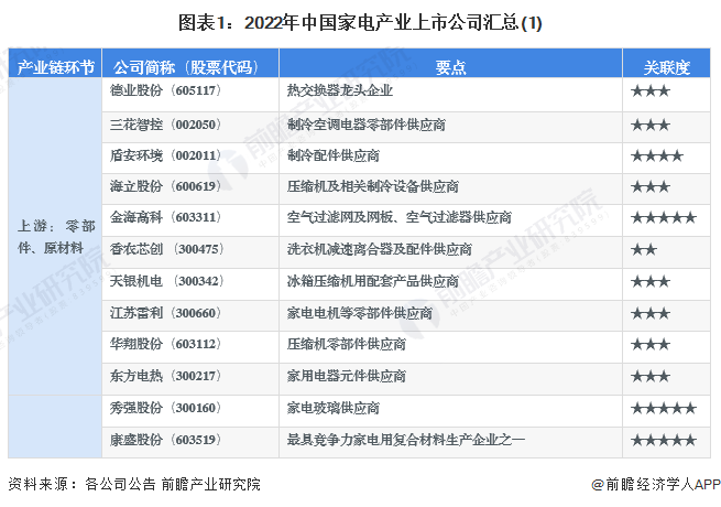 家电行业的产业链上游主要为零部件和原材料供应商,包括压缩机、电机、电子元器件、家电用复合材料等,中游为各类型家电生产企业。家电行业产业链上下游的主要上市公司汇总如下: