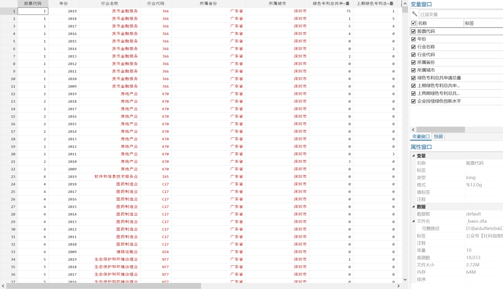 数据指标:股票代码、年份、行业名称、行业代码、所属省份、所属城市、绿色专利总共申请总量、上期绿色专利总共申请总量、上两期绿色专利总共申请总量、企业持续绿色创新水平