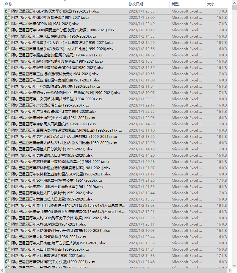 具体包含的每个指标一个多年度的excel数据文件大致如下(注意,不是每个国家都包含如下excel文件,这里下面只是一个通用的说明。每个国家包含的具体指标请参照上图)