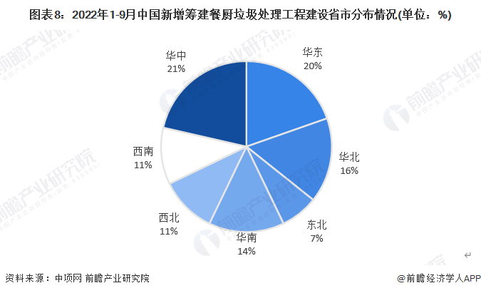 按区域分布来看,2022年1-9月,我国已披露的新增筹建的餐厨垃圾处理项目主要分布在华中地区和西南地区,数量均为12项,合计占比全国新增数量的21%。