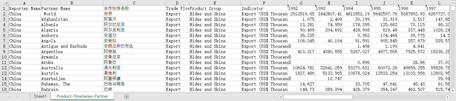 Reporter Name Partner Name 合作伙伴名称 Trade Flow Product Group Indicator 1992 1993 1994 1995 1996 1997 1998 1999 2000 2001 2002 2003 2004 2005 2006 2007 2008 2009 2010 2011 2012 2013 2014 2015 2016 2017 2018 2019 2020