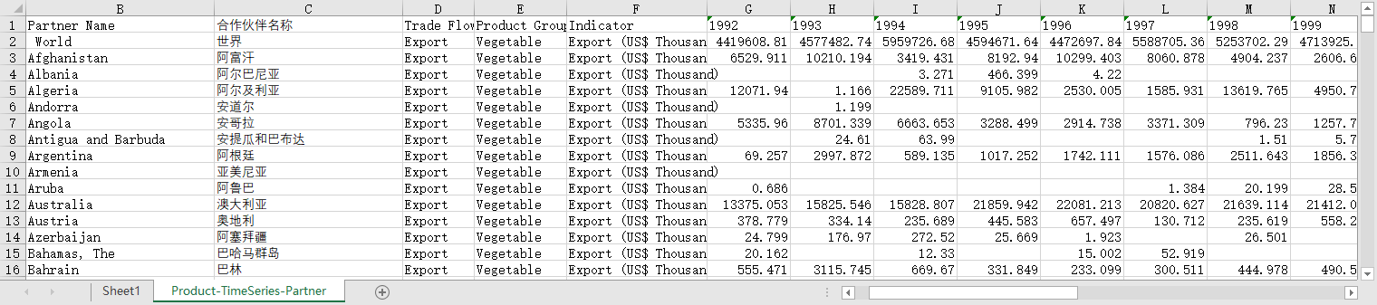 Reporter Name Partner Name 合作伙伴名称 Trade Flow Product Group Indicator 1992 1993 1994 1995 1996 1997 1998 1999 2000 2001 2002 2003 2004 2005 2006 2007 2008 2009 2010 2011 2012 2013 2014 2015 2016 2017 2018 2019 2020
