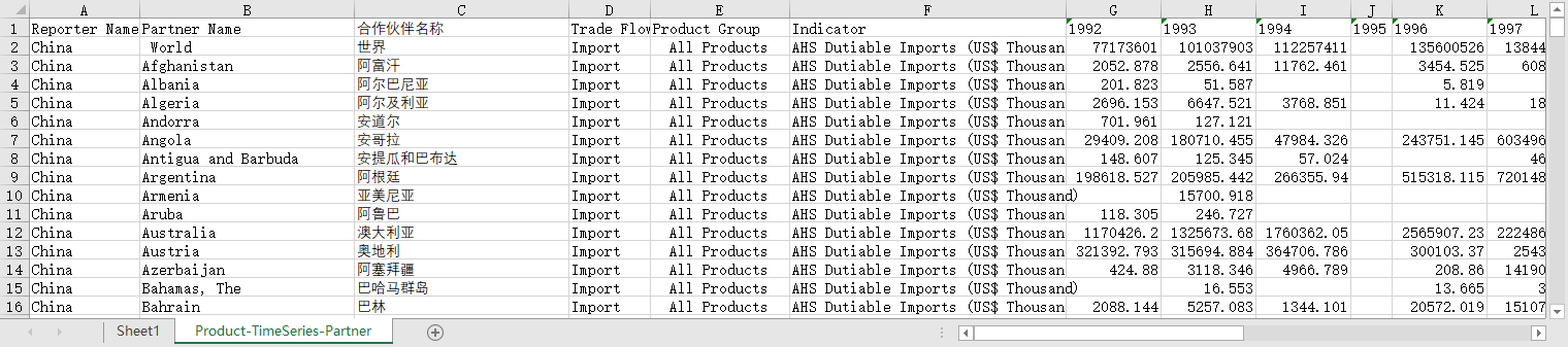 Reporter Name Partner Name 合作伙伴名称 Trade Flow Product Group Indicator 1992 1993 1994 1995 1996 1997 1998 1999 2000 2001 2002 2003 2004 2005 2006 2007 2008 2009 2010 2011 2012 2013 2014 2015 2016 2017 2018 2019 2020
