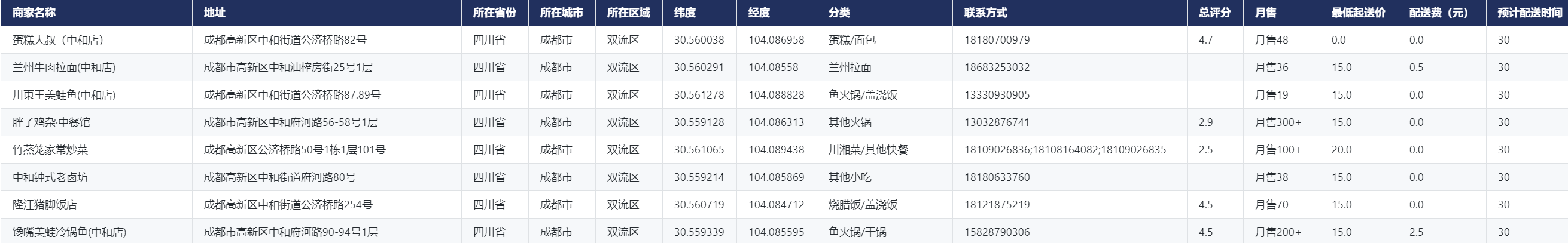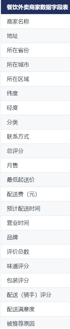 餐饮外卖商家数据,共包含北京、上海、西安、重庆等25个城市信息,不同城市来源在数据量方面各不相同,主要包含商家名称、地址、总评分、月售等关键字段。