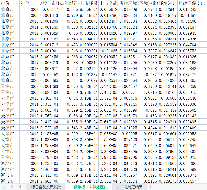 2008-2020年30个省绿色金融发展指数、三级指标计算结果