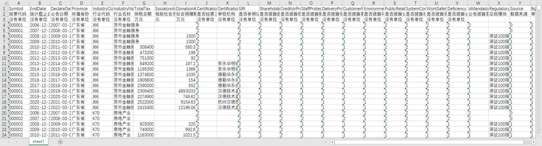 股票代码 统计截止日期 公告日期 所属省份 行业代码 行业名称 纳税总额 每股社会贡献值 社会捐赠额 是否经第三方机构审验 审验机构 是否参照GRI《可持续发展报告指南》 是否披露股东权益保护 是否披露债权人权益保护 是否披露职工权益保护 是否披露供应商权益保护 是否披露客户及消费者权益保护 是否披露环境和可持续发展 是否披露公共关系和社会公益事业 是否披露社会责任制度建设及改善措施 是否披露安全生产内容 是否披露公司存在的不足 公告披露意愿 应规模块 数据来源 审计师是否来自四大会计师事务所