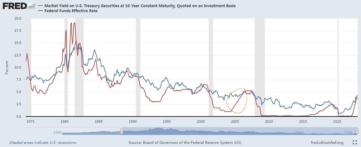 要回答这个问题首先需要弄清楚美联储2004年开始加息后究竟发生了什么事?美联储从2004年7月开始连续加息,一直到2006年7月,利息从1加到5.25,但同期美国十年期国债利率基本没有变化,