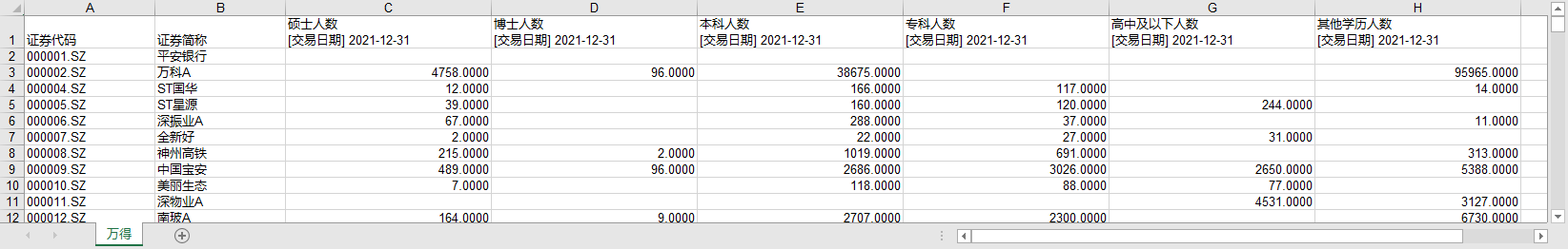 证券代码 证券简称 硕士人数、博士人数、本科人数、专科人数、高中及以下人数、其他学历人数