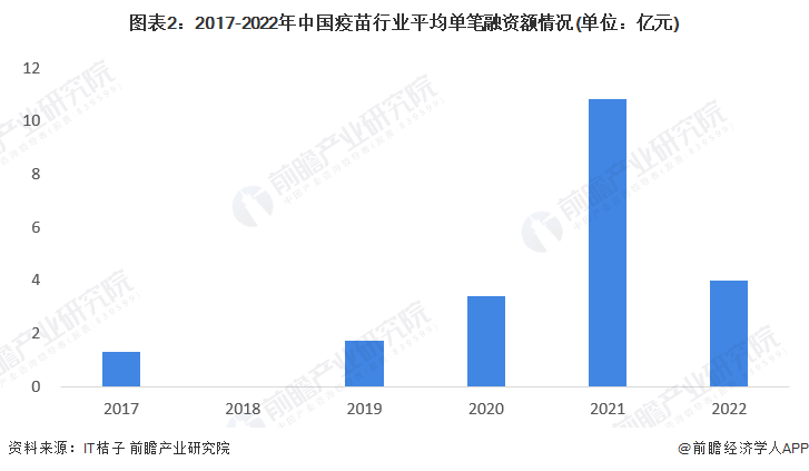 从平均单笔融资额来看,2017-2022年,除2020年、2021年和2022年的平均单笔融资额超过3亿元外,其他年份的平均单笔融资额均未超过3亿元。2021年平均单笔融资额达到峰值,达到了10.81亿元。