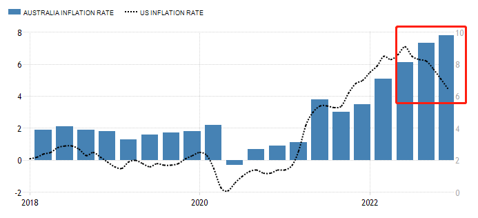 蓝色柱状线是澳大利亚的名义CPI增速,显而易见,高通胀的问题仍在持续,2022年四季度达到7.8%,创出近二十多年新高。黑色虚线是美国的名义CPI增速,2022年7月份开始,美国的高通胀问题就已经缓解。中央银行加息的主要目的是遏制高通胀,美联储的目的已经阶段性达成,逐步停止激进加息政策符合逻辑。澳大利亚经济仍深受高通胀困扰,此时放缓加息步伐,有可能导致通胀率进一步走高。当然,澳大利亚的名义CPI增速每季度公布一次,图中数据的截止日期是2022年12月份。如果今年一月份和2月份的名义CPI增速出现下降,那么澳洲联储退出激进加息政策的选择符合逻辑。