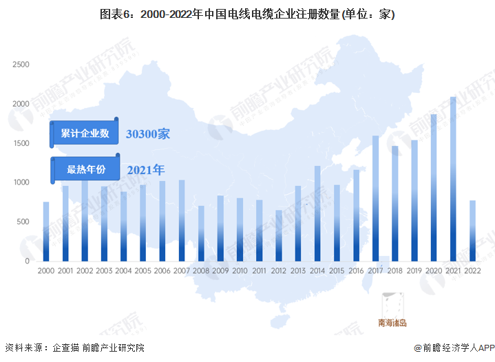 我国电线电缆行业的企业数量众多,其中以中小企业居多。根据中国企业数据库企查猫,截至2022年12月27日,中国电线电缆行业的主要企业共有30300家,其中以2021年为主要注册热潮,当年注册企业数量为2095家,而2022年则为778家。