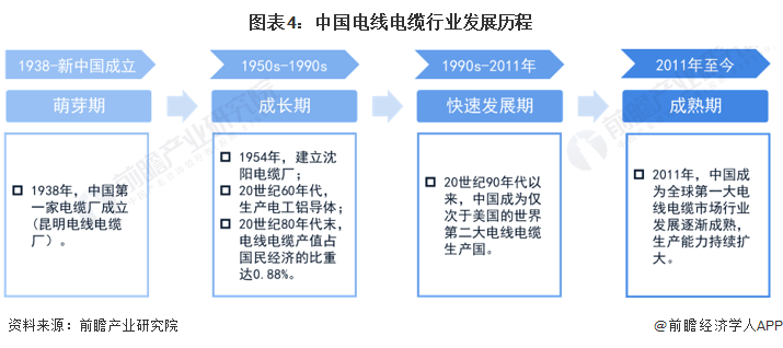 20世纪90年代以来,我国电线电缆业获得高速发展,中国也是仅次于美国的世界第二大电线电缆生产国。2011年,中国电线电缆产业规模首次超过美国,成为全球电线电缆行业第一大市场。随后,随着我国电线电缆市场快速发展,行业已经步入成熟阶段。