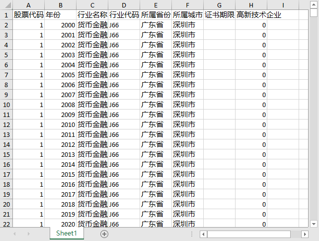 股票代码 年份 行业名称 行业代码 所属省份 所属城市 证书期限 高新技术企业