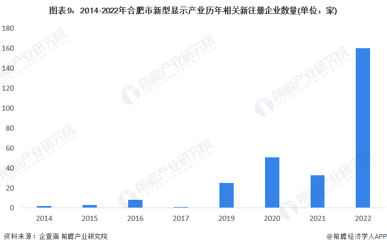 根据企查猫查询数据显示,近年来新型显示历年新注册企业数量呈波动性增长趋势,2019年后,新型显示行业热度开始凸显,2022年,合肥新型显示产业注册企业数量显著增长,为160家。总体来看,新型显示企业由于其技术含量较高,技术研发周期较长的原因,合肥市行业内企业数量有待提高。