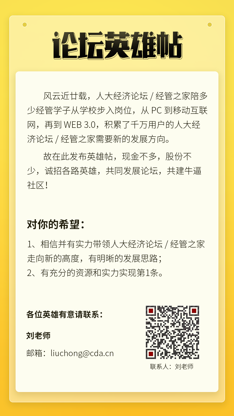 论坛求贤若渴,现招募愿与经管之家论坛共同发展的有志之士,有意向沟通请添加图内微信(请注明来意)。