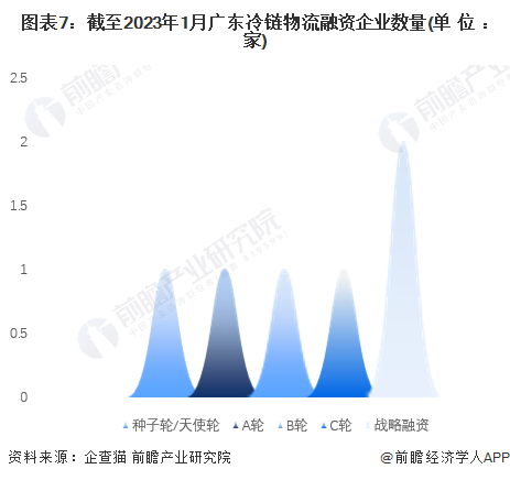 根据中国企业数据库企查猫,目前广东省存续和在业的冷链物流企业共1438家,其中共有7家企业有融资信息。截至2023年1月,广东冷链物流企业中,各有1家企业为种子轮/天使轮、A轮、B轮、C轮融资和定向增发,2家企业为战略融资。