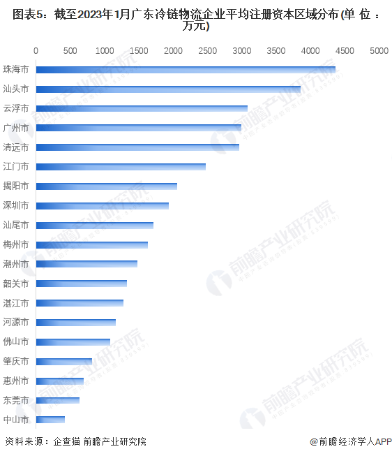 根据中国企业数据库企查猫,目前广东冷链物流企业的平均注册资本区域分布中,珠海相关企业的平均注册资本最高为4368.5万元,除此外,山东、云浮和广州的冷链物流企业平均注册资金均较高。