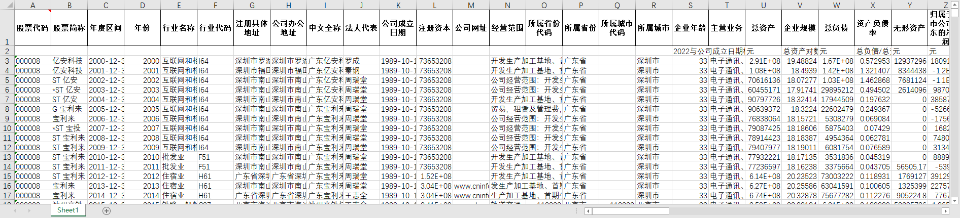 股票代码 股票简称 年度区间 年份 行业名称 行业代码 注册具体地址 公司办公地址 中文全称 法人代表 公司成立日期 注册资本 公司网址 经营范围 所属省份代码 所属省份 所属城市代码 所属城市 企业年龄 主营业务 总资产 企业规模 总负债 资产负债率 无形资产 归属于上市公司股东的净利润 净利润 营业收入 营业成本 营业利润 证券简称 第一大控股股东 第一大股东持股比率(%) 前十大股东持股比例(%) 实际控制人名称 实际控制人性质编码 实际控制人拥有上市公司股份性质 股权性质 股权性质编码 层级判断 创始人 两权分离率(%) 发起人 监管层总人数 其中:女性监管层人数 董事人数 其中:女性董事人数 其中:独立董事人数 监事人数 高级管理人员数 其中:女性高级管理人员数 监管层持股数量 董事会持股数量 监事会持股数量 高级管理人员持股数量 监管层年薪总额 其中:监管层津贴总额 董事薪酬总额 监事薪酬总额 高级管理人员薪酬总额 监管层前三名薪酬总额 董事前三名薪酬总额 监事前三名薪酬总额 高级管理人员前三名薪酬总额 未领取薪酬监管层人数 其中:未领取薪酬董事人数 其中:未领取薪酬监事人数 监管层第一名薪酬 董事第一名薪酬 监事第一名薪酬 高级管理人员第一名薪酬 持有本公司股份的董事总人数 持有本公司股份的监事人数 流动比率 速动比率 现金比率 营运资金 权益乘数 产权比率 财务杠杆 经营杠杆 综合杠杆 资产报酬率 总资产净利润率(ROA) 固定资产净利润率 净资产收益率 长期资本收益率 营业毛利率 营业成本率 营业净利率 销售费用率 管理费用率 财务费用率 投资收益率 研发费用率 固定资产增长率 总资产增长率 利润总额增长率 营业利润增长率 所有者权益增长率 每股净资产增长率 公司专利累计 发明授权 发明专利 实用新型 外观设计 ZF补助 研发投入总额 研发投入强度 研发人员数量 研发人员数量占比 资本化研发投入 资本化研发投入占研发投入比例