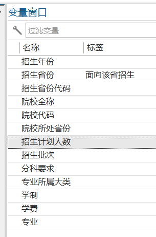 包含招生年份、招生省份、院校全称、专业、专业所属大类、招生批次、分科要求、学制、学费、招生计划人数等变量。