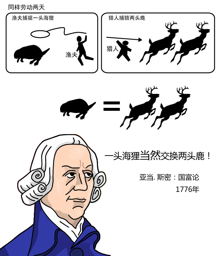 在两百多年前出版的《国富论》(国民财富的性质和原因的研究)中,英国经济学家亚当. 斯密说:“在资本累积和土地私有尚未发生以前的初期野蛮社会,获取各种物品所需要的劳动量之间的比例,似乎是各种物品相互交换的唯一标准。例如,一般地说,狩猎民族捕杀海狸一头所需要的劳动,若二倍于捕杀鹿一头所需要的劳动,那末,海狸一头当然换鹿二头。”【1-1】