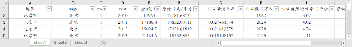 数据指标:地区 name code year gdp亿元 房价(元/平方) 人口净流入率 人口数(万人) 人口自然增长率(千分) 劳动力平均受教育年限 失业率(%) 人均GDP
