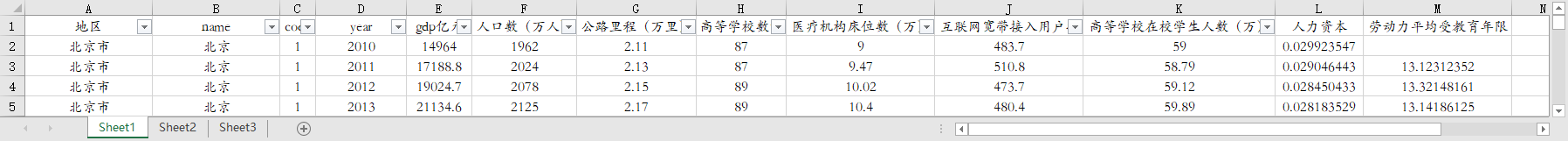 数据指标:地区 name code year gdp亿元 人口数(万人) 公路里程(万里) 高等学校数量 医疗机构床位数(万) 互联网宽带接入用户数 高等学校在校学生人数(万) 人力资本 劳动力平均受教育年限