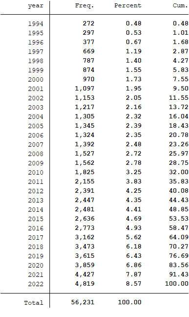 样本选择:全部A股1994-2022年数据(“五因子模型指标日”在数据库中是从1994-01-03开始,所以数据起点为1994年)