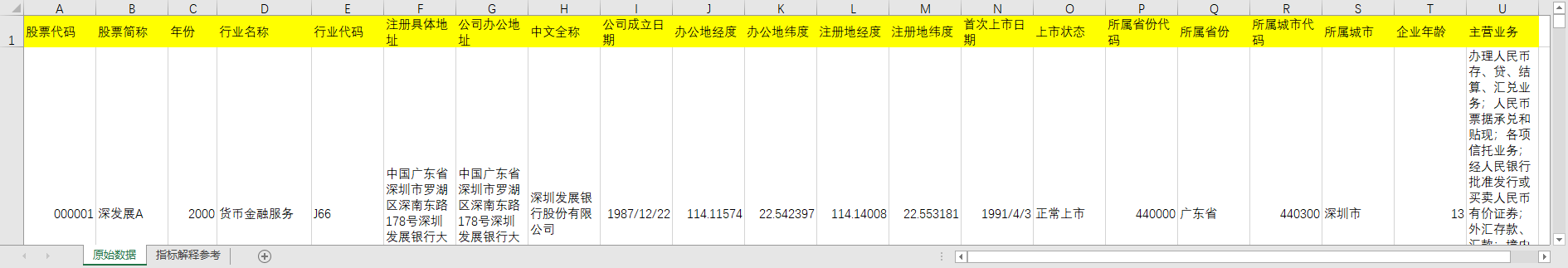 代码 简称 年份 行业名称 行业代码 注册具体地址 公司办公地址 中文全称 公司成立日期 办公地经度 办公地纬度 注册地经度 注册地纬度 首次上市日期 上市状态 所属省份代码 所属省份 所属城市代码 所属城市 企业年龄 主营业务