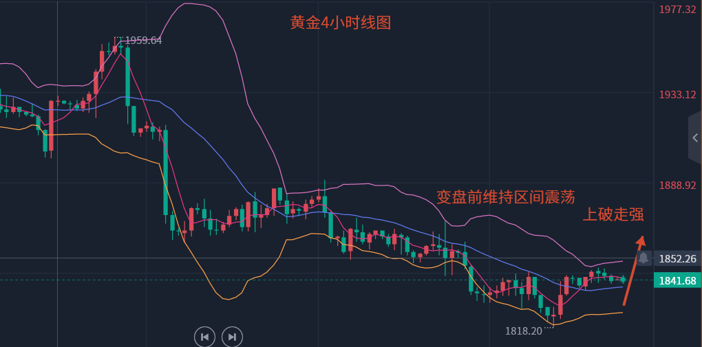 昨天金价继续走出窄幅震荡,价格最低1837一线,最高47一线,幅度10个点,日图最终以一根小阴十字报收,从当前盘面来看,日图空头依然不变,但是至1818反弹以来,价格在日图的下线与二线之间运行,结构上有两种预期,一是价格在二线附近反复蓄势最终一举破下线,二是多次不破再走一次破底诱空式,不管哪种这都是主观分析,而客观来看,在当下只要不破二线这里多头反弹动能不变,而上方昨天离四小时上线差了几块,价格在47一线直接回落,明显也有压制,而小时图又是在上下线之间运行,所以综合来看多周期不共振,震荡依旧,目前如果想走出大动静,静待四小时和日图破位共振,一旦破位后市向上幅度预期是30-65个点,所以在没破位之前继续做震荡。