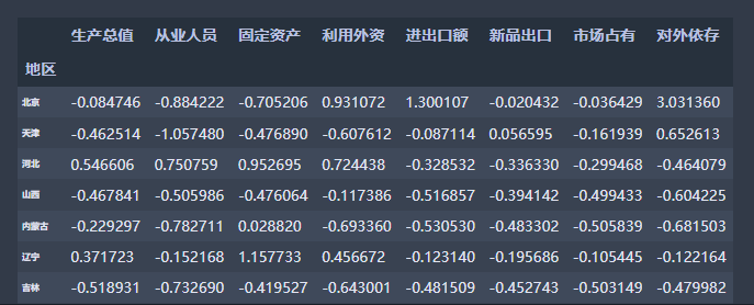 data = pd.read_excel(r'C:/Users/AROUS/Desktop/综合评价案例数据.xlsx', index_col = '地区')