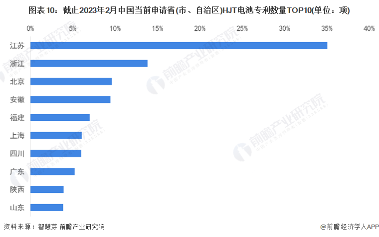 中国方面,江苏为中国当前申请HJT电池专利数量最多的省份,累计当前HJT电池专利申请数量高达702项,遥遥领先于其他地区。其次是浙江,专利数量达277项。中国当前申请省(市、自治区)HJT电池专利数量排名前十的省市还有北京、安徽和福建等。