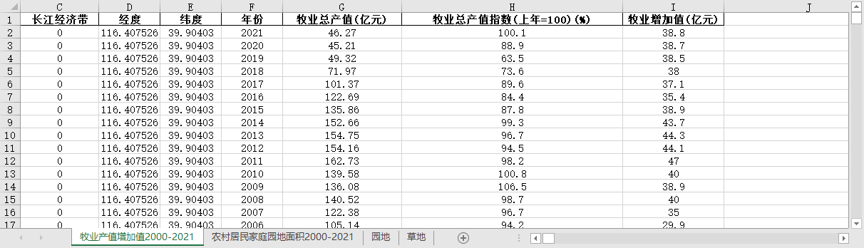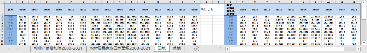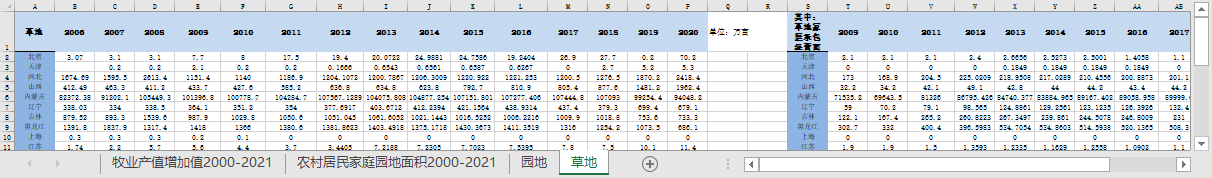 全国30个省份牧业总产值指数增加值农村居民家庭经营园地面积2000-2021村集体所有的园地草地面积数据