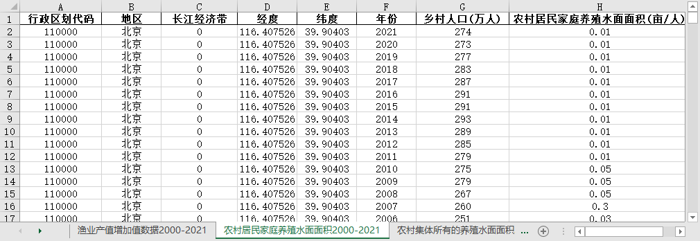 | 行政区划代码 | 地区 | 长江经济带 | 经度 | 纬度 | 年份 | 农村居民家庭养殖水面面积(亩/人) | 乡村人口(万人) |