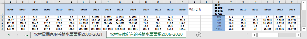 农村集体所有的养殖水面面积2006-2020,另外含养殖水面归村所有的面积、养殖水面归组所有的面积