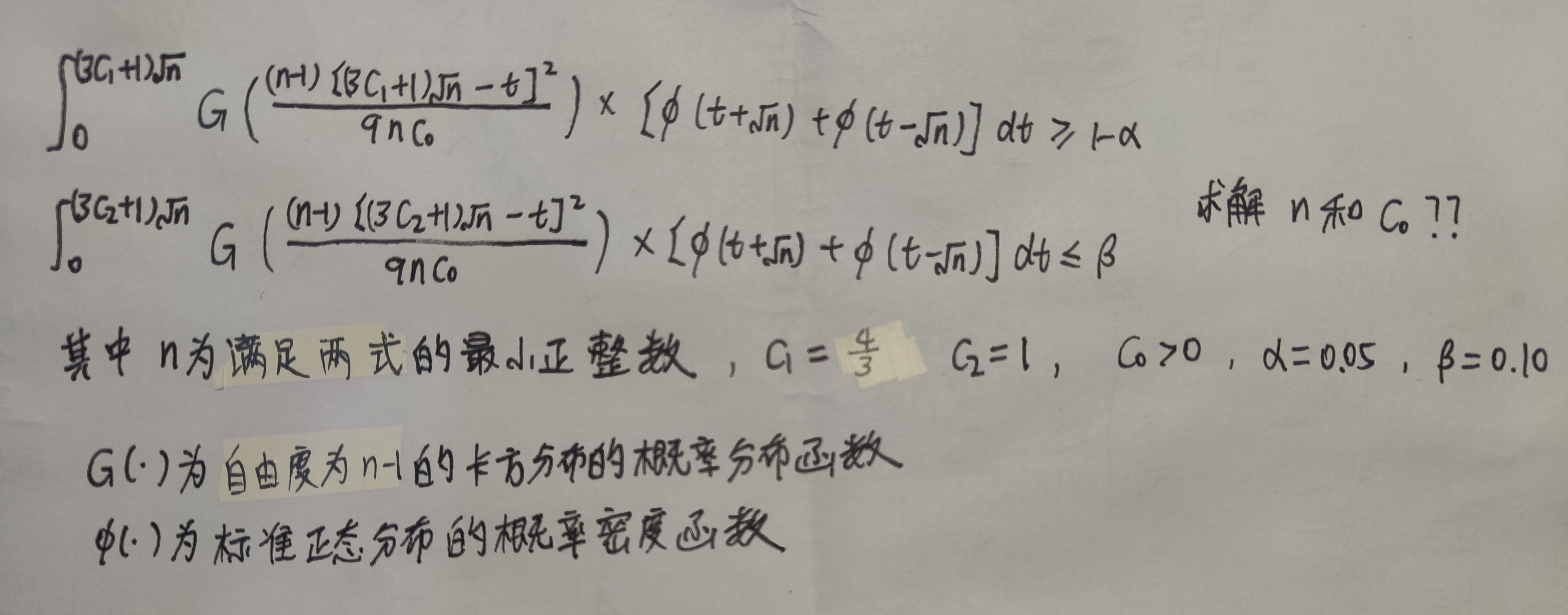 【初步求解思路:首先选定个较小的n (如n=2),利用二分法查找出第一个公式在等式成立时C0的值:再将上述值代入第二个式子,以验证所求得的C0是否满足第二个式子; 如不满足,则样本量n的值加 1,直到第一个式子解出的n和C0也满足第二个式子】