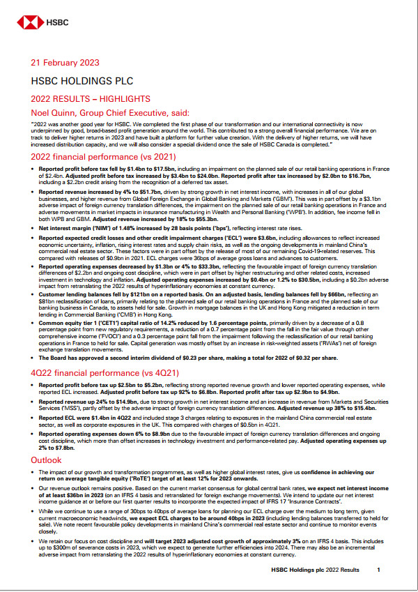 2023年2月21日最新发布的HSBC汇丰银行2022年度财报-媒体发布版,另有“投资人、分析家版”