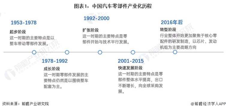我国汽车零部件产业化主要经历了五个发展阶段。目前我国正处于大力发展高精尖技术,打破国外技术垄断的进程当中,当前我国汽车核心零配件仍处于进口依赖的阶段。