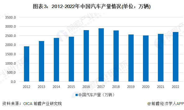 根据OICA统计披露的数据显示,2012-2021年,全球和中国的汽车产量均呈波动态势,在2019年以前全球和中国汽车产量走势基本相同,但在2020年全球汽车产量较大下滑的时候,中国的汽车产量维持与2019年差距较小的水平。2021-2022年,中国汽车产量有所回升。2022年中国汽车产量达到2701.1万辆。由此来看,中国汽车零部件整车配套市场需求有所回升。