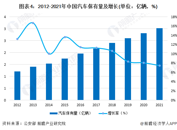 再从中国汽车零部件行业汽车维修市场需求来看,根据公安部数据统计,2010-2018年,我国汽车保有量增速均高于9%,保持着比较稳定的增速。截至2020年底,全国汽车保有量达2.81亿辆。截至2021年底,全国汽车保有量达3.02亿辆,存在较大汽车维修市场需求。
