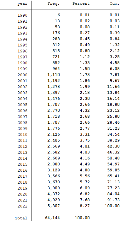 样本选择:全部A股1990-2022年数据(“日个股回报率文件”和“综合日市场回报率文件”在数据库中均是从1990-12-19开始,所以数据起点为1990年)