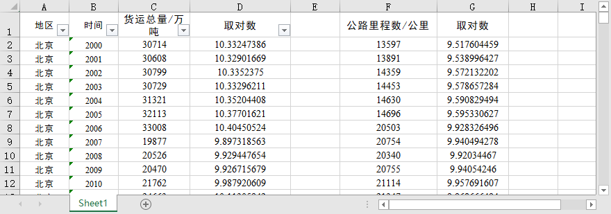 数据指标:地区 时间 货运总量/万吨 取对数 公路里程数/公里 取对数