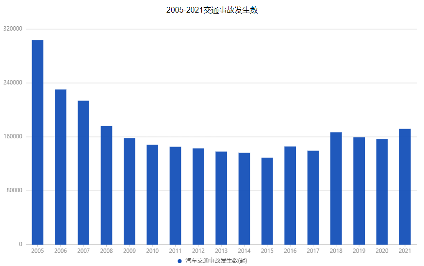 可以看到从2005年以后,交通事故发生数量逐年下滑,一直到2018年以后,出现小幅回升,并维持在相对稳定状态