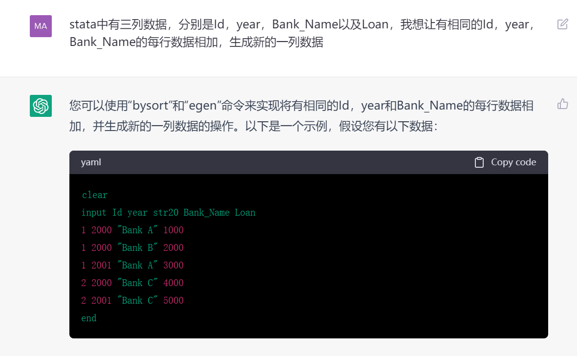 第一行和第三行的Id,year,和Bank_Name一样,所以就应该把Loan相加,这用Stata要怎么实现(能用代码吗,有一万多条数据,最好不要手工相加)?