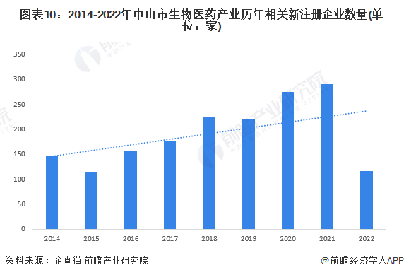 根据企查猫查询数据显示,近年来生物医药产业新注册企业数量也快速增长。截至2023年2月13日,中山市生物医药产业相关的注册企业超2600家,自2018年后新注册企业数量突破新台阶,2021年新注册企业达291家;2022年新注册企业数量为117家,目前中山市生物医药产业的发展较为火热。