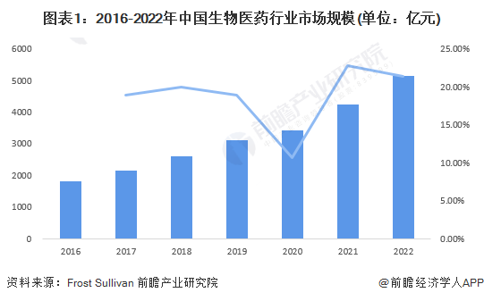 受老龄化加剧、社会医疗卫生支出增加和行业研发投入增多等因素的推动,近年来中国生物医药行业市场规模保持较快增长。据Frost & Sullivan报告数据显示,从2016年到2022年,中国生物医药行业市场规模从1836亿元增长到5162亿元,年均复合增长率达到18.80%。根据中国发改委印发的《“十四五”生物经济发展规划》,提出顺应“以治病为中心”转向“以健康为中心”的新趋势,发展面向人民生命健康的生物医药,满足人民群众对生命健康更有保障的新期待,重点发展药品、疫苗、先进诊疗技术和装备、生物医用材料、精准医疗、检验检测及生物康养等方向。